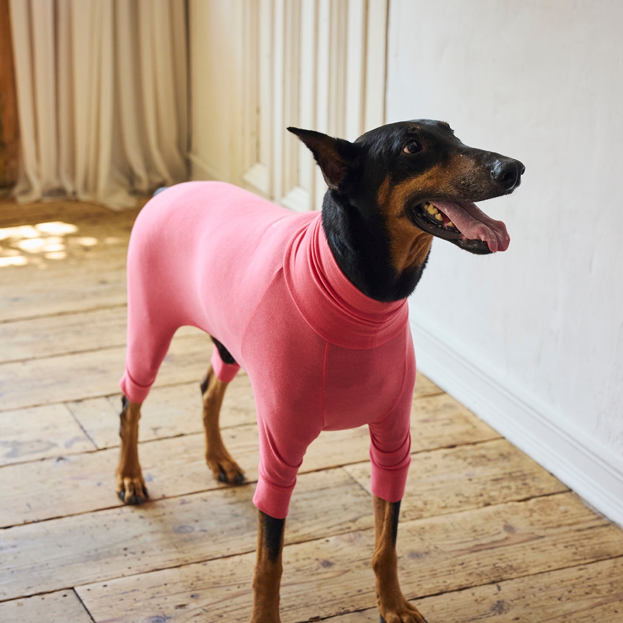 ①とってもオススメ!ピッタリフィットしていますが、生地がとても柔らかく伸びがよいため一日中着てくれています。寝る時もまったく窮屈そうではなくのびのびしています。毛が摩擦されないためか、着始めてから毛艶がとても良くなりました!!すごくオススメです!(K様)