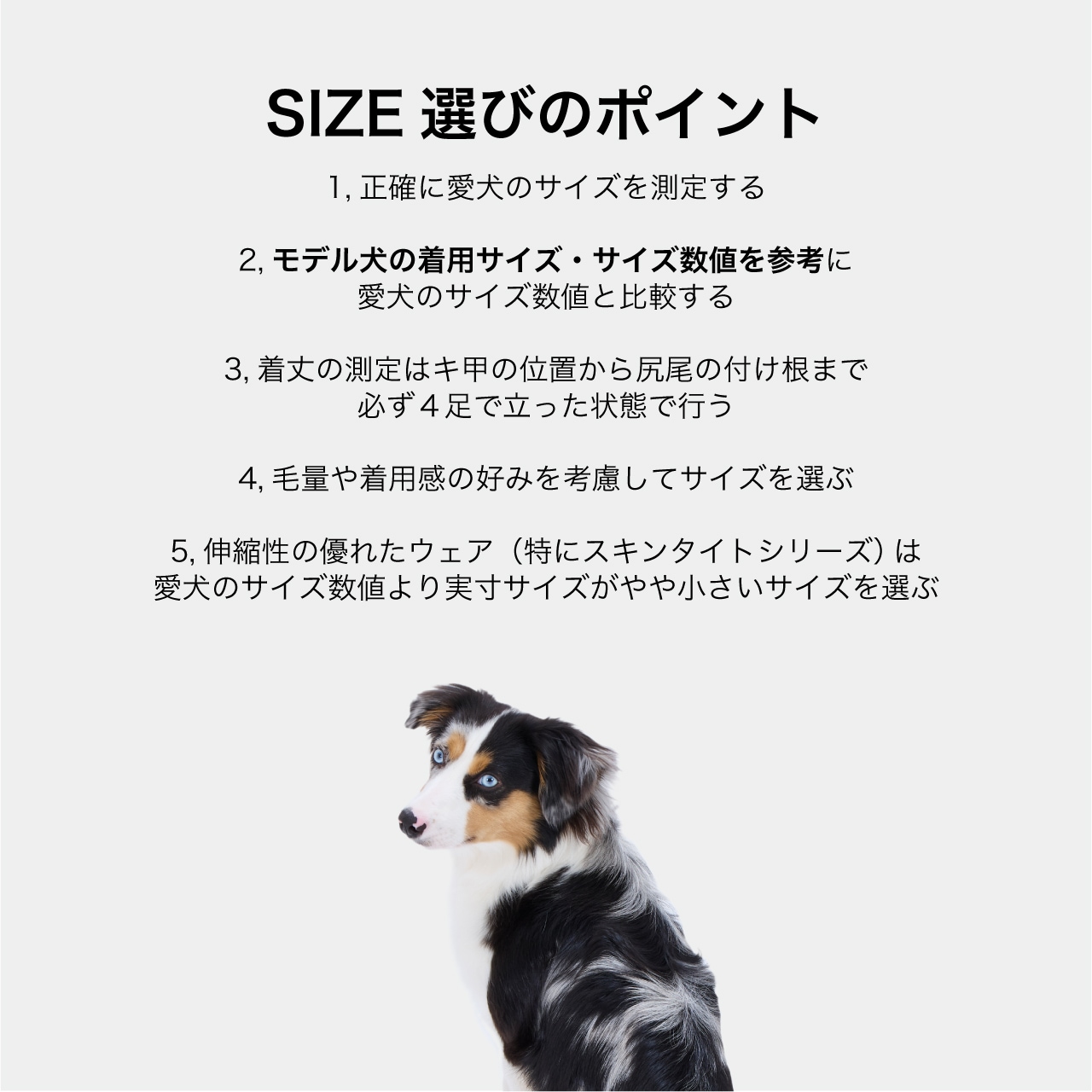 「スキンタイトスーツ」を、開発する時にこだわったのは、生地の伸縮性と着心地です。柔らかく肌触りの良い生地でありながら、縦横に優れた伸縮性を備えています。全身を覆うロンパースタイプでありながらも、愛犬にとってはストレスフリーな着心地になるよう、小型犬から大型犬までさまざまな犬種に合わせて、スタッフの愛犬たちにも何度も試着に協力してもらい、1年以上の試行錯誤を重ねて開発されました。