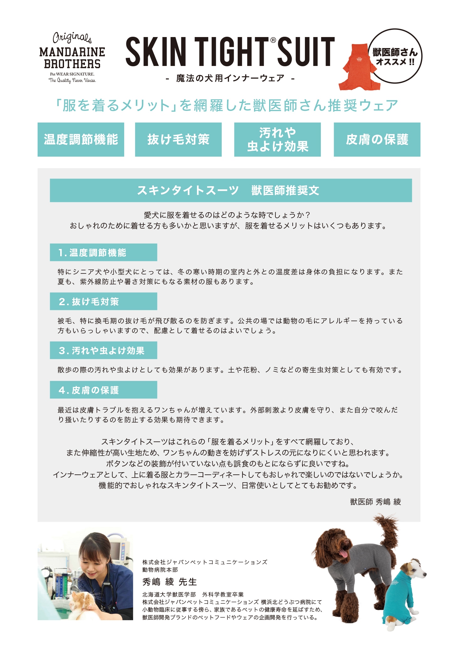 冬のお出かけはワンちゃんの防寒対策を! これからクリスマスシーズンやお正月など、家族と過ごす楽しいイベントが目白押し♪ ワンちゃんの寒さ対策をしっかりしつつ、愛犬との冬のイベントシーズンを楽しみましょう。 以上、MANDARINE BROTHERSのスキンタイトスーツとウォームTシャツのご紹介でした!